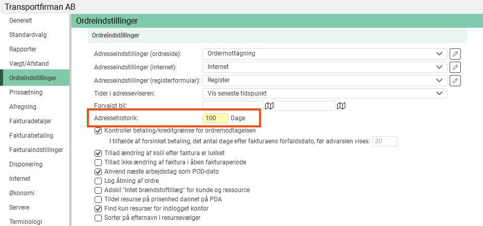 Klik på Indstillinger > Kontor, og gå til fanen Ordreindstillinger. Angiv, hvor mange dage du ønsker, at adresser skal gemmes, efter at de er blevet brugt, i tekstfeltet Adressehistorik.