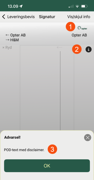 Du kan vise kundens logo på underskriftssiden (1) ved at vælge et billede på fanen Leveringsbevis (POD) i kunderegistret og derefter tilføje feltet Kundelogo [CUSTOMERLOGOTYPE] på fanen Leveringsbevis i Designfelt til mobil, eller med tagget CUSTOMERLOGOTYPE i App.OpterDriver.Design.