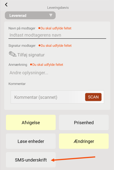 (Hvis knappen SMS-underskrift ikke vises på siden Leveringsbevis i disse scenarier, skyldes det indstillinger foretaget af din systemadministrator).