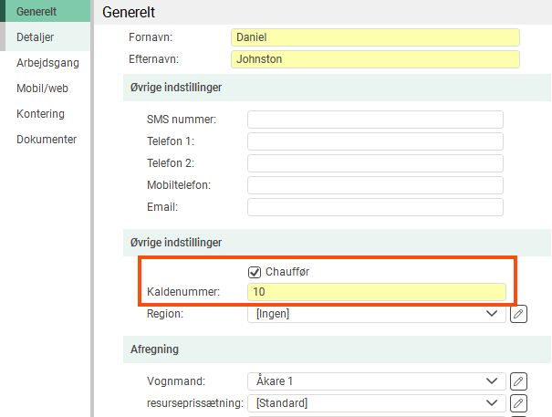 Vælg en medarbejder på listen til venstre, og vælg derefter Chauffør på fanen Generelt. Du skal også angive chaufførens telefonnummer. Hvis chaufføren ikke er opført som ansat, skal du tilføje vedkommende ved at klikke på Ny.