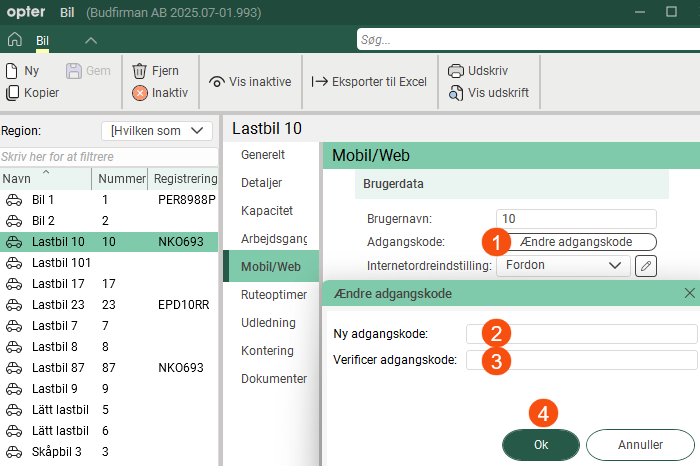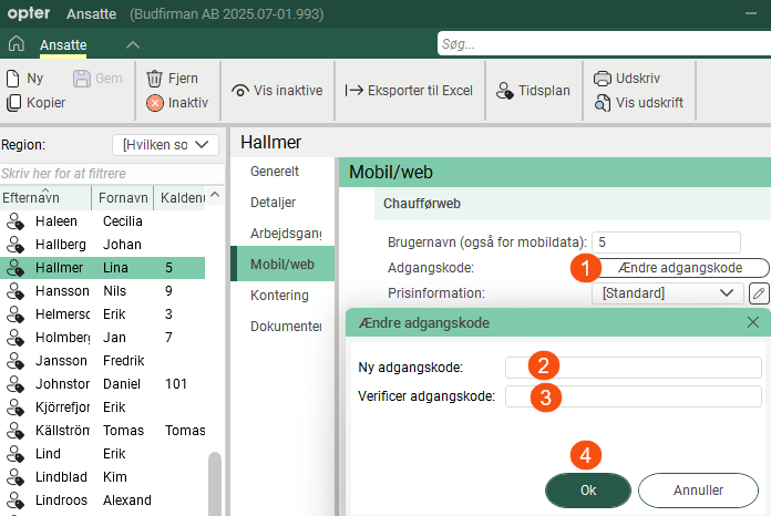Klik på Ændre adgangskode (1), og indtast adgangskoden i begge felter (2 og 3). Klik derefter på Ok (4), så gemmes adgangskoden.