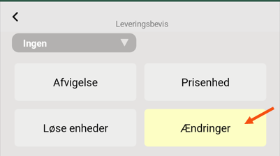 På billedet ovenfor vises knappen SCAN i feltet Kommentar (5), det betyder, at du kan eller skal scanne en kommentar (f.eks. scanne et Fragtbrev). Feltet Tilføj billede (6) er gult. Det betyder, at du skal tilføje et billede. Knappen Afvigelse (7) er gul. Det betyder, at du skal tilføje en afvigelse. Knapperne Prisenhed (8) og Løse enheder (9) er grå. Det betyder, at du kan tilføje artikler og løse enheder, hvis du vil, men det er ikke påkrævet. Knappen Gem (10) er grå. Det betyder, at du ikke kan gemme leveringsbeviset, før du har udfyldt alle de obligatoriske oplysninger.