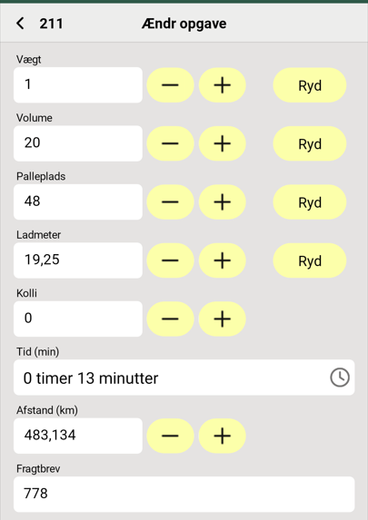 Du kan ændre opgaverne, hvis f.eks. antallet af pakker eller rejsetiden ikke er korrekt. Klik på Ændringer, foretag dine ændringer, og klik derefter på Gem i øverste højre hjørne. (Ændringerne bliver dog ikke gemt, før du har udfyldt hele leveringsbeviset og klikket på Gem nederst på siden med leveringsbeviset.)