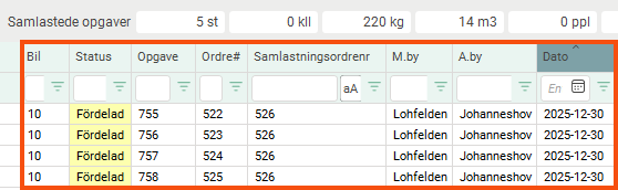 Billedet nedenfor viser, hvordan det kan se ud i disponeringen, når vi har tilføjet kolonnen Samlastningsordrenr..