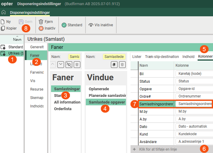 I sektionen Faner skal du vælge den fane, hvor du vil tilføje kolonnen Samlastningsordrenr..