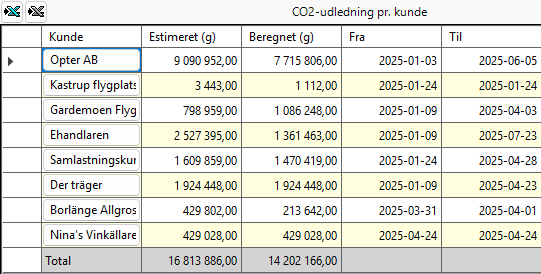 Du kan manuelt producere en statistisk rapport, når du vil, og så ofte du vil. Du kan finde yderligere oplysninger i Opret statistikrapport over CO2-udledning i gram. Billedet nedenfor viser, hvordan det kunne se ud, hvis du valgte at vise statistikken pr. kunde. Flere detaljer vises, hvis du klikker på kundens navn.