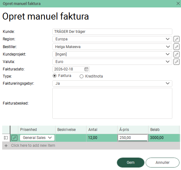Klik på Fil > Manuel faktura. Vinduet Opret manuel faktura åbnes.