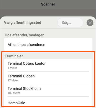 For at kunne få vist de nærmeste terminaler øverst i listen af valgbare terminaler i appen skal terminalerne have en position i Opter og være indenfor en radius af 500 meter fra mobilenhedens position.