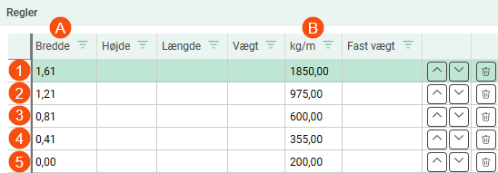 Hvis bredden (A) er 1,61 meter eller mere, bruger Opter faktoren (B) 1850 kg/m til vægtberegningen.