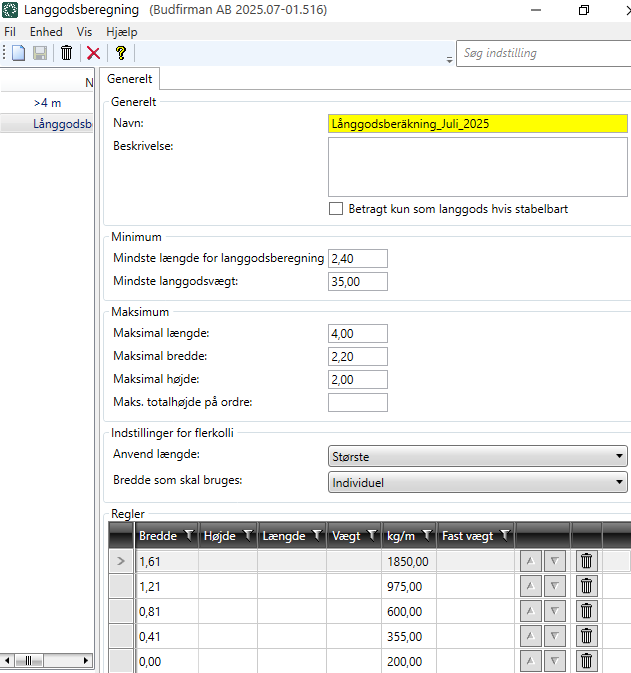 I vinduet Vægtberegning på fanen Generelt skal du kontrollere, at den korrekte langgodsberegning er valgt i rullelisten Langgodsberegning (hvis du har flere forskellige).
