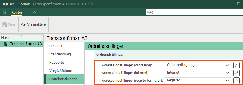 Vælg de adresseindstillinger, der skal bruges som standard for de forskellige adressegrupper i ordremodtagelsen og i registrene.