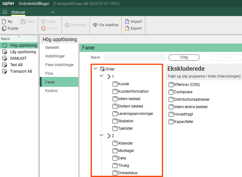 Den fane (mappe), der ligger øverst i listen, vil blive vist yderst til venstre, og den fane, der ligger nederst, vil blive vist yderst til højre i ordremodtagelsen.