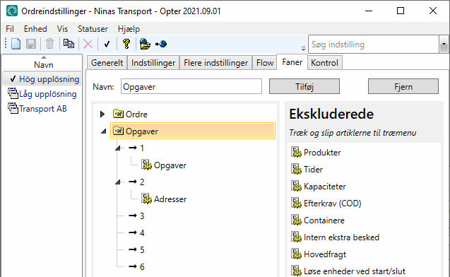 Den fane (mappe), der ligger øverst i listen, vil blive vist yderst til venstre, og den fane, der ligger nederst, vil blive vist yderst til højre i ordremodtagelsen. Se Organiser sektionerne i ordremodtagelsen herunder