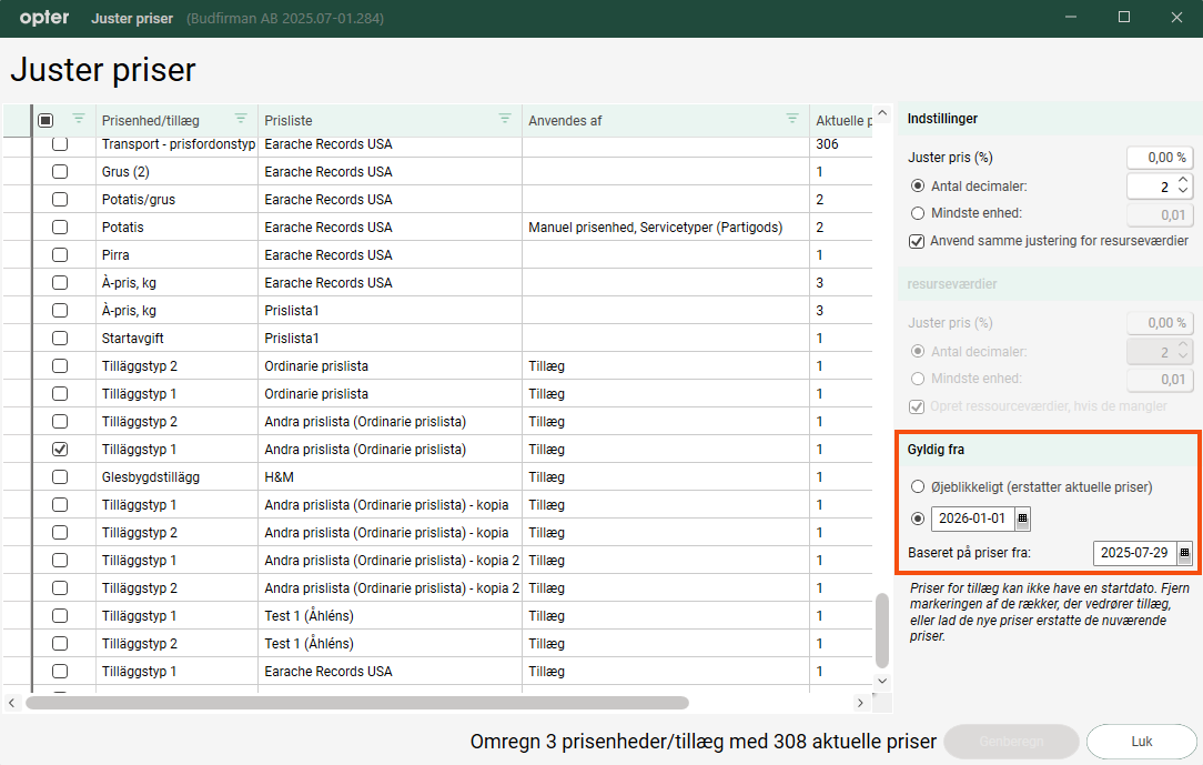 Denne funktion gælder ikke for prisjusteringer af tillæg. Prisændringer på tillæg træder altid i kraft med det samme og erstatter altid de aktuelle priser.