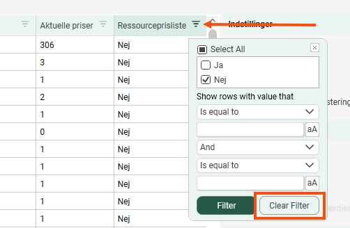Når du åbner vinduet, er listen allerede filtreret til ikke at vise ressourceprislister. Hvis du også ønsker at justere ressourcepriserne, skal du klikke på i den kolonne og vælge Clear Filter.