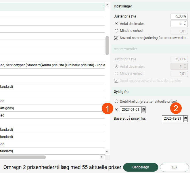 I december 2025 opretter den bydende virksomhed en ny prisgenerering, der skal gælde i 2026. Det øger de nuværende priser med 5%. Samtidig vil de benytte lejligheden til at skabe endnu en prisgeneration, så prisen stiger med yderligere 5 % fra 1. januar 2027 (1). Men den stigning skal være baseret på de priser, der gælder i 2026, ikke de priser, der gælder nu, hvor prisdannelsen er skabt. Derfor udfylder de 2026-12-31 i feltet Baseret på priser fra (2).