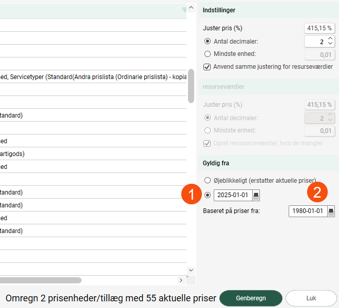 De har også en mangeårig loyal kunde med en prisliste, der følger forbrugerprisindekset. Derfor har de tilføjet en prisgeneration, der starter fra 1980-01-01 med prisen 80 SEK. Den første januar hvert år opdaterer de denne prisliste i henhold til det foregående års forbrugerprisindeks. I 2024 var CPI-gennemsnittet 415,15. Budgiveren opretter derfor en prisgenerering gældende fra 1. januar 2025 (1) med prisjusteringen 415,15 % baseret på prisen pr. 1. januar 1980 (2).
