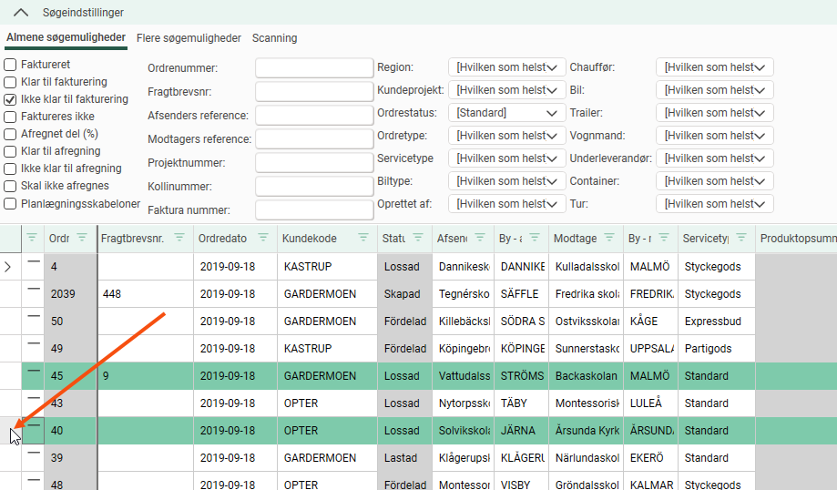 Åbn ordrekontrollen, og søg efter de ordrer, du vil genberegne priser for. Hvis du ikke ønsker at genberegne alle ordrer i ordrelisten, kan du vælge enkelte ordrer ved at klikke på rækken længst til venstre (Ctrl- eller Shift-klik for at vælge flere rækker).