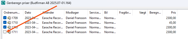 Højreklik på den, og vælg Genberegn priser. Der vises en liste over alle ordrer, der er omfattet af fakturaen. Hvis der er en ordre på listen, som du ikke ønsker at genberegne prisen for, skal du fravælge den.