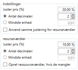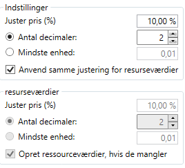 Kundeprisen justeres i henhold til procentsatsen under Indstillinger. Nye ressourceværdier baseres på kundeprisen før justering (2 000) og justeres i henhold til procentsatsen (0 %) under Resurseværdier. |