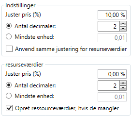 Hvis du justerer kundepriser og ressourceværdier forskelligt, har du mulighed for at føje nye ressourceværdier til prismatrixen, hvis den mangler et sted, ved at markere Opret ressourceværdier, hvis de mangler. Den nye ressourceværdi baseres på den gamle kundepris og den procentvise justering. Hvis kundeprisen var 100, og ressourceværdierne skal justeres med 10 %, vil den nye ressourceværdi, der tilføjes til matrixen, være "110" (den oprindelige kundepris 100 + 10 %).