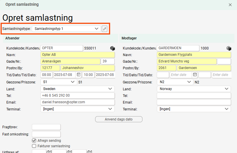 Det er nu muligt at tilpasse adressefelterne for nye samlastninger, der oprettes i disponering, på samme måde som i Ordremodtagelse. De adressefelter, der vises, styres af den ordrevisning, der er indstillet til samlastningstypen.