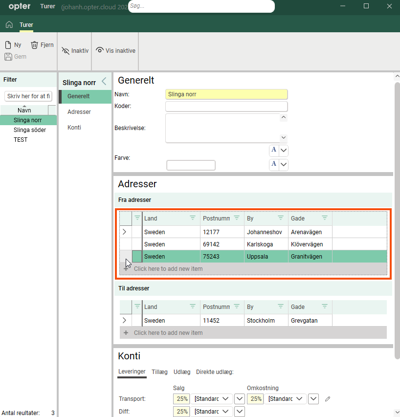 Det er nu muligt at indsætte ture fra Excel. Kolonnerne for land, postnummer, by og gade i Excel skal være i samme rækkefølge som i Turer-vinduet. Vælg rækkerne i Excel, og kopier dem. Opret derefter en ny linje i Turer -vinduet, og indsæt med Ctrl+V, eller overskriv de eksisterende adresselinjer ved at placere markøren på den første linje og indsætte.
