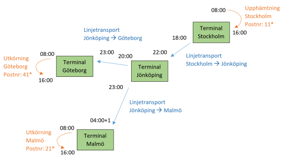 Navn Starttid Sluttid Dag Afhentning København 08:00 16:00 Dag 1 Linjetransport Stockholm-Jönköping 18:00 22:00 Dag 1 Linjekørsel Jönköping-Malmö 23:00 04:00+1 Dag 1 Udkørsel Skagen 08:00 17:00 Dag 2 Seneste udkørsel 17:00 Dag 2