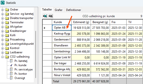 De felter, der har en indre ramme, kan man klikke på for at se flere detaljer. Hvis du f.eks. vil se flere detaljer om en bestemt kunde, skal du klikke på kunden i tabellen, se billedet nedenfor.