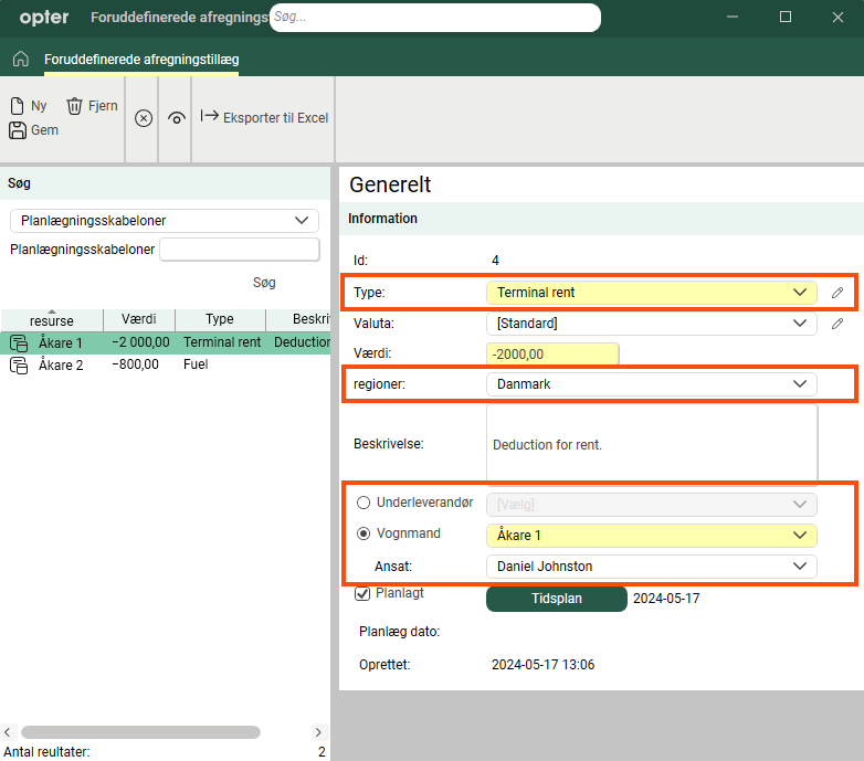 Tillægget oprettes i henhold til tidsplanen og lægges derefter til afregningen næste gang vognmanden/underleverandøren afregnes. Hvis du afregner en gang om måneden, skal du planlægge tillægget, så det oprettes en gang om måneden. Hvis du afregner en gang om ugen, skal du planlægge tillægget, så det oprettes en gang om ugen. På den måde bliver det automatisk tilføjet til hver afregning.