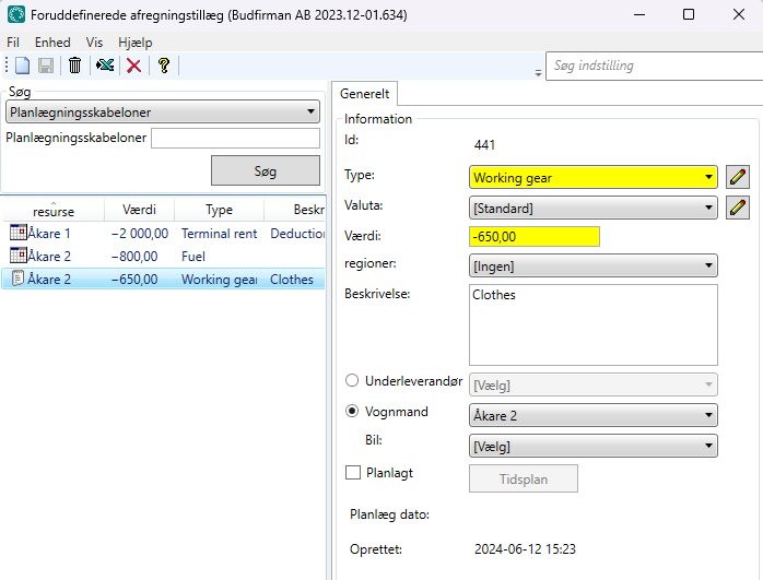 Planlagte afregningstillæg opsættes for en bestemt vognmand/underleverandør i vinduet Foruddefinerede afregningstillæg.