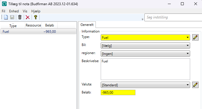 Beløbet vises i alle tre valutaer i vinduet Tillæg til nota.