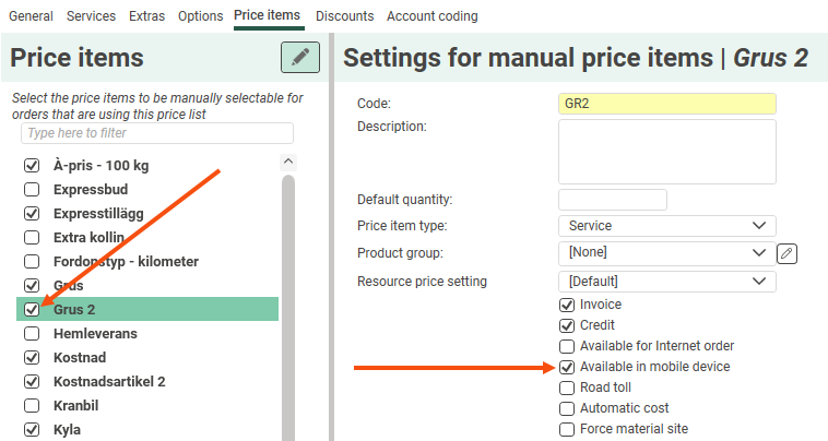 Go to Economy > Price lists > Price lists > Price items tab. Make sure that the Price items you want to link to material sites are ticked in the list, and that Available in mobile device is selected.