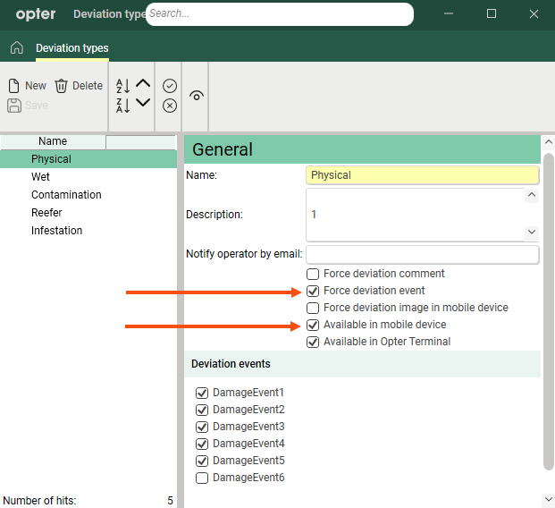 You set which deviation types, deviation events and deviation reasons can be selected in Opter Driver by selecting Available in mobile device in the respective register under Settings > Deviations.