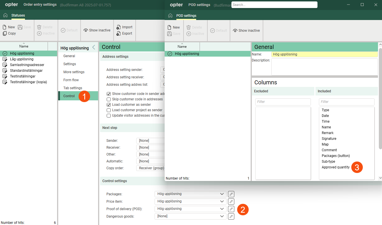 If the column Confirmed packages is not displayed in the Order reception, you can find it in the order settings. Go to the Control tab (1), click on next to the Proof of delivery (POD) drop-down menu (2) and move Approved quantity to Included (3).