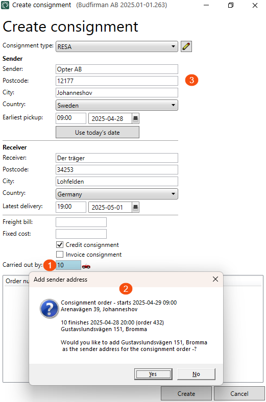 The sender address (3) is then changed directly in the Create consignment window, and the consignment is then created from that address (3).