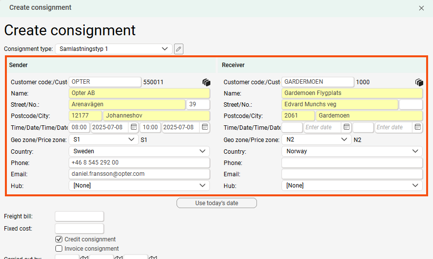 When you create a new consignment order in the dispatch system, the Create consignment window opens where you enter the sender and recipient of the consignment order. You can customise which fields are displayed for the addresses in that window by creating an order view and setting it to the consignment type.