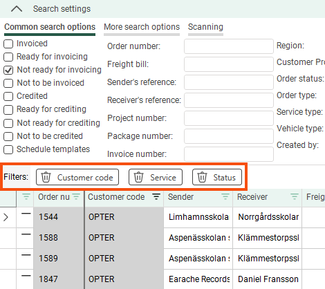 Adjust your search settings and click on Search. You can then refine your search results further using the column filters. The information displayed in the columns is described in section Consolidate orders (window) below. |