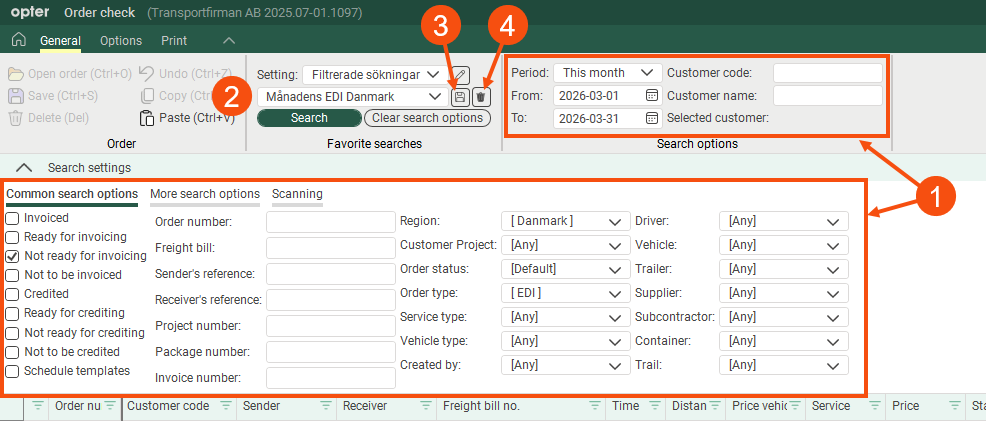 You can save searches you perform frequently so that you can use them again quickly. For more information, see Saving searches in order check. [Default]: Search for today's orders that are not ready for invoicing. You can change the search settings, but they will be reset when you close the control. If you want to save a search, select the criteria you want to search by (1), enter a name in the field (2) and save it (3). You are deleting a saved search with
