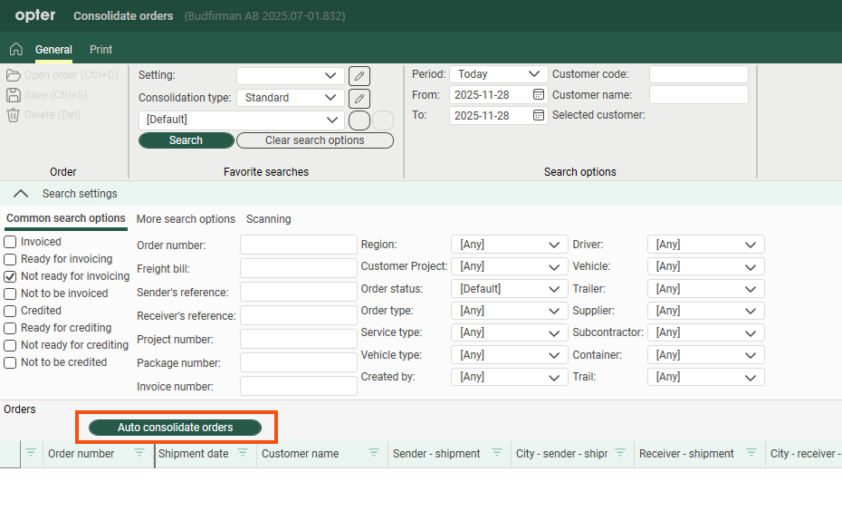 Consolidating orders means combining several orders into one. The transport operations are not affected. To combine transport operations, see Consignment, overview instead.