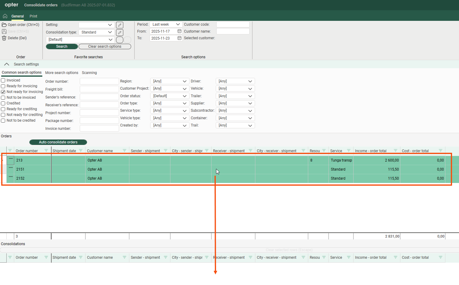 Select the orders you want to consolidate in the list Orders and drag and drop them into the list Consolidations at the bottom of the window.