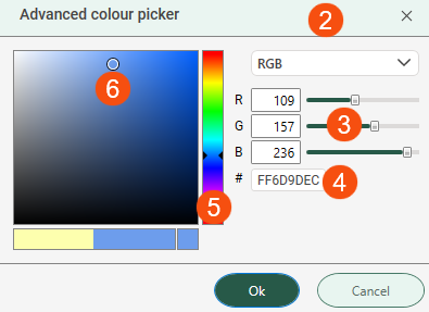 If you want more colours to choose from, click on Advanced (1). The advanced colour picker will then open (2) and you can freely choose the colour. For example, you can enter a colour code as an RGB value (3) or hexadecimal value (4).