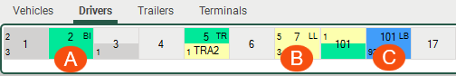 Choose the colour of the resource boxes if, for example, a logged-in resource is on a lunch break (C) or if the resource has both allocated and loaded, perhaps also unloaded, shipments (B).