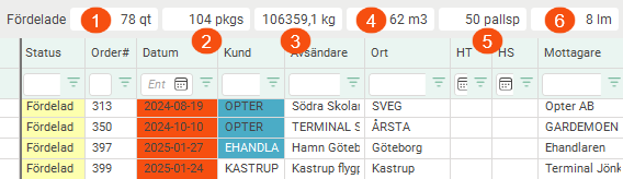 Total weight/total number of Pallet spaces/total number of load metres for the shipments that, according to the life cycle settings, affect the vehicle load. If an order has several shipments, the weight/pallet spaces/load metres are counted once for each shipment on the order. |