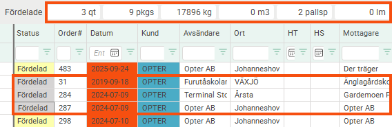 If you mark orders/shipments in the dispatch, only the marked orders/shipments are totalled. In the image below we have highlighted three orders/shipments.