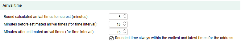 Example: You round up to the nearest 10 minutes. The delivery time of the order is 16:00-18:00. If the estimated delivery time according to the route optimisation is 18:17, it is rounded to 18:00, not 18:20.