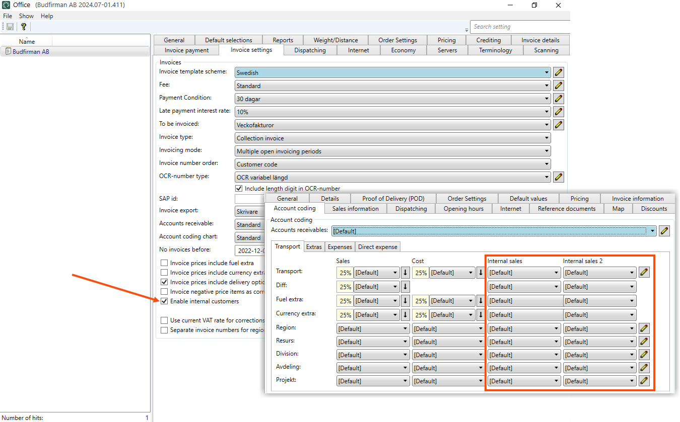 Click on Settings > Offices > Invoice settings tab and select Enable internal customers. This enables the entire function and brings up the account coding settings for internal customers (see step 5 below).