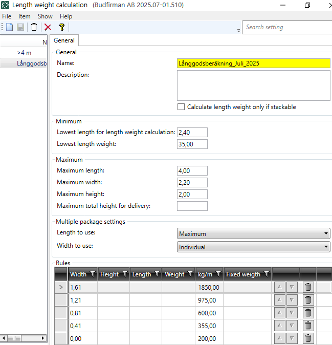 In the Length weight calculation window, you can set the rules for weight calculations of long goods. For more information, see Setting up weight calculation for long goods and Calculating the pricing weight.