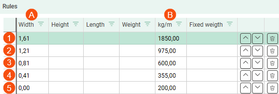In the table (in the box Rules), enter the rules that will apply to the long goods weight calculation. Enter one line per row.