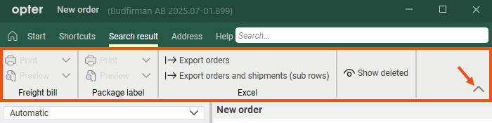 If you find that the menu area (ribbon menu) takes up too much space in the Order reception window, you can make it smaller (step 1) or close it completely (step 2) by doing one of the following